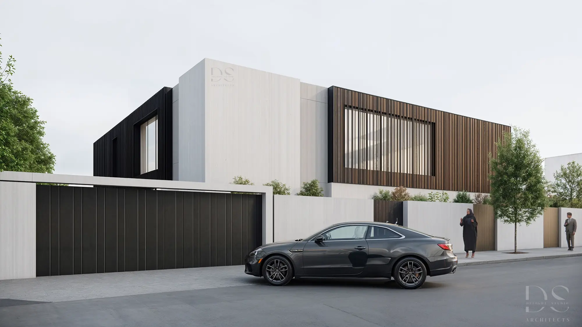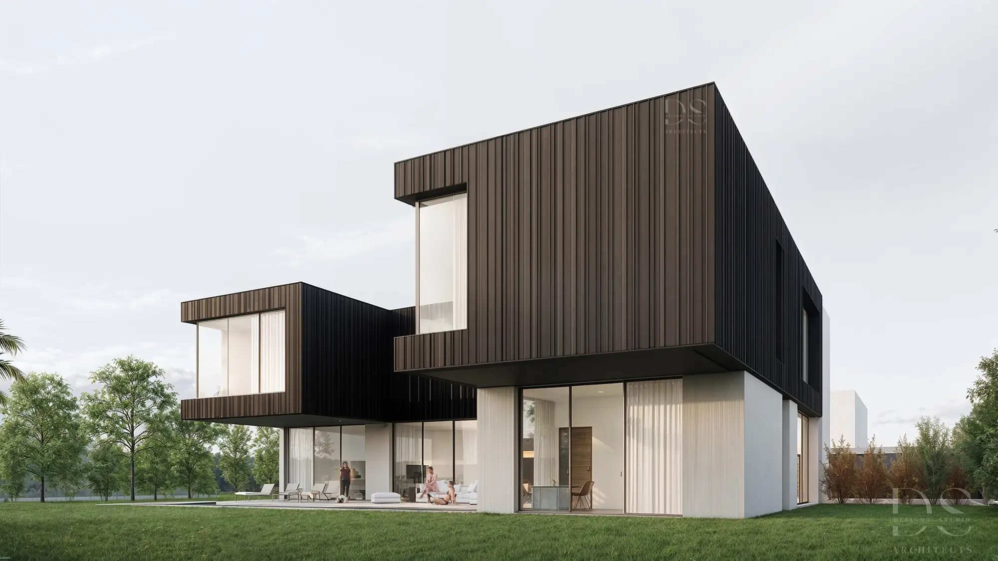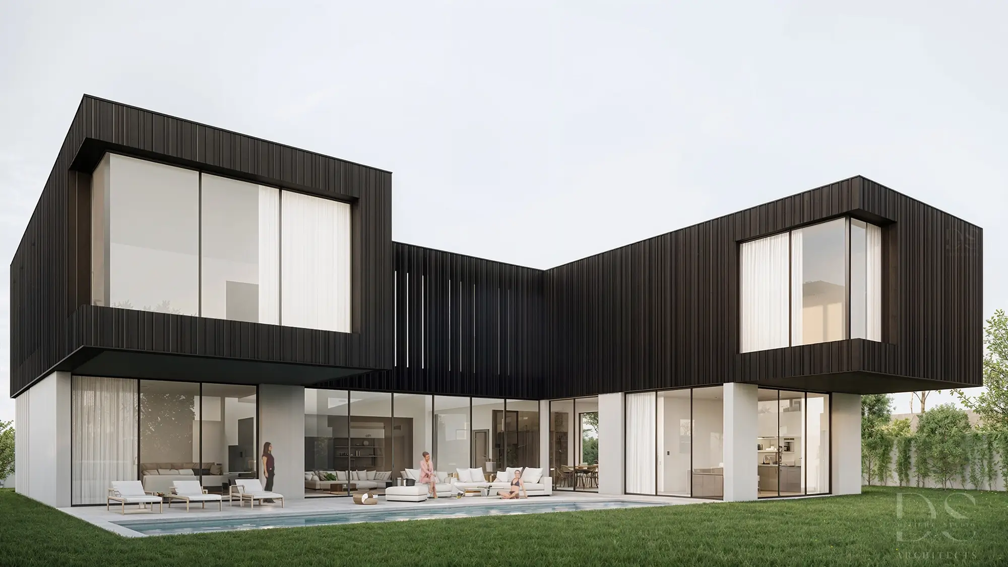 Cette villa joue sur l'opposition subtile entre matiéres et couleurs pour un rendu à Ia fois moderne et intemporel. Le revétement métallique anthracite s'accorde à I'enduit gris clair effet pierre, offrant une profondeur visuelle marquée. Depuis I'entrée, Ies volumes géométriques slimposent avec sobriété, tandis qulå I'arriére, Ies larges baies vitrées assurent une parfaite continuité avec les espaces extérieurs.